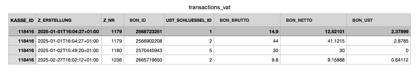 Wichtige Funktion: Diese Datei ermöglicht es dem Finanzprüfer, schnell die gesamte steuerliche Belastung jedes einzelnen Bons zu überprüfen. Die Summen in dieser Datei müssen mit den Beträgen in der Haupttabelle (transactions.csv) und der detaillierten Aufschlüsselung der Positionen (lines_vat.csv) konsistent sein, wodurch die korrekte und lückenlose Erfassung der Umsatzsteuer sichergestellt wird. Sie ist ein Schlüsselwerkzeug für die Umsatzsteuerprüfung transactions_vat