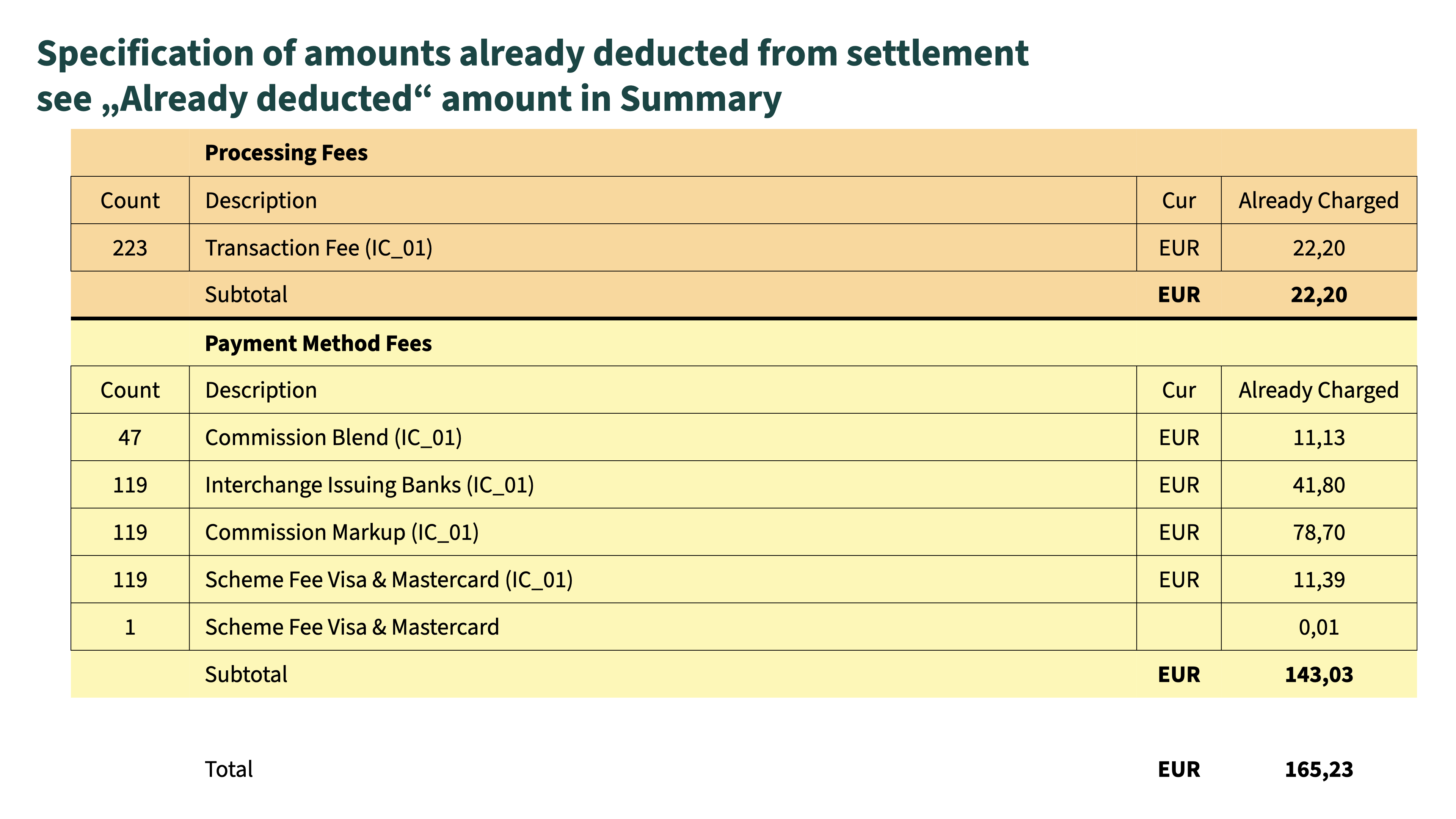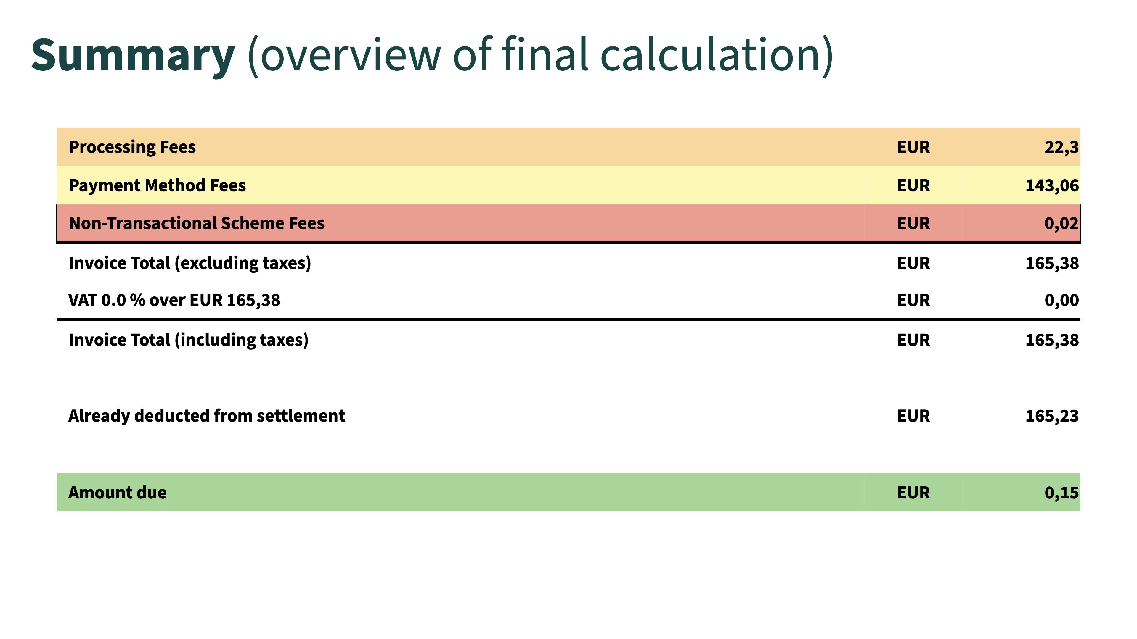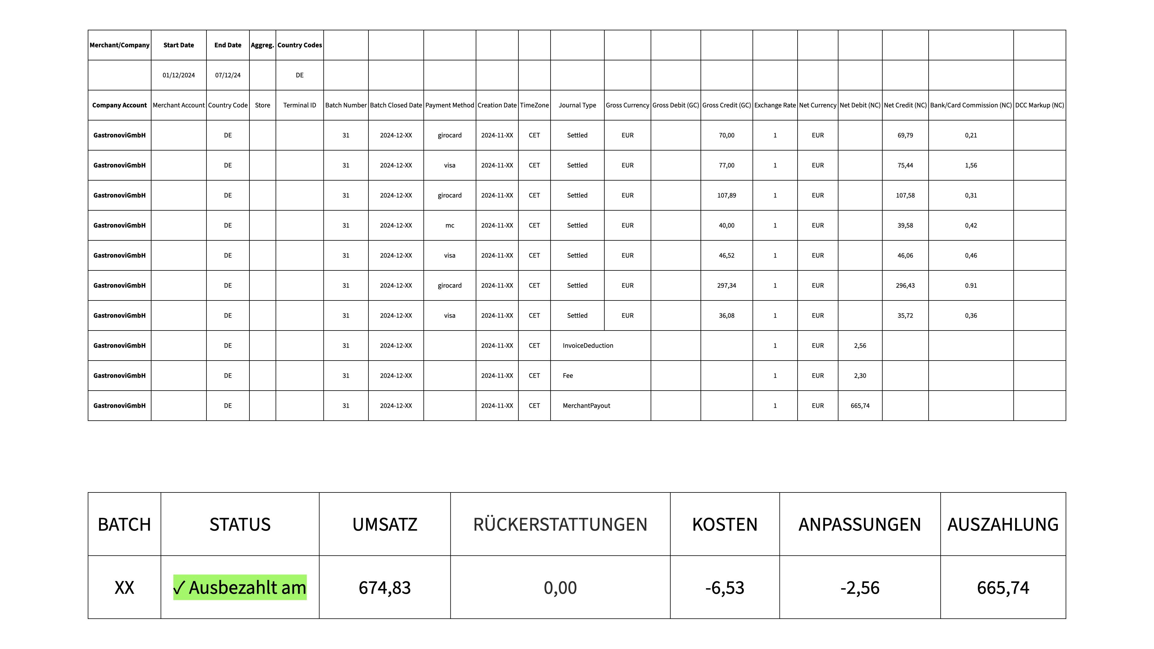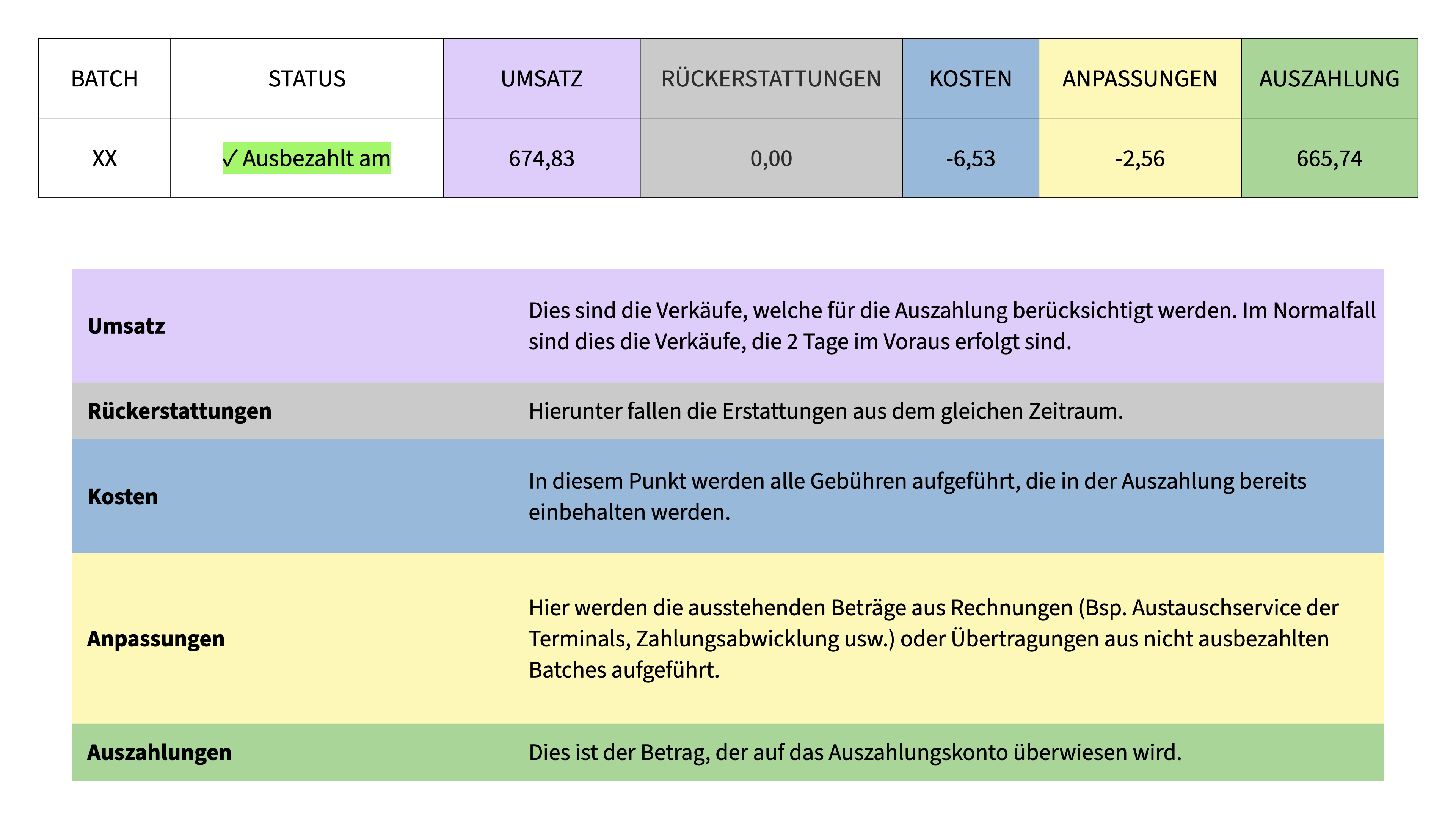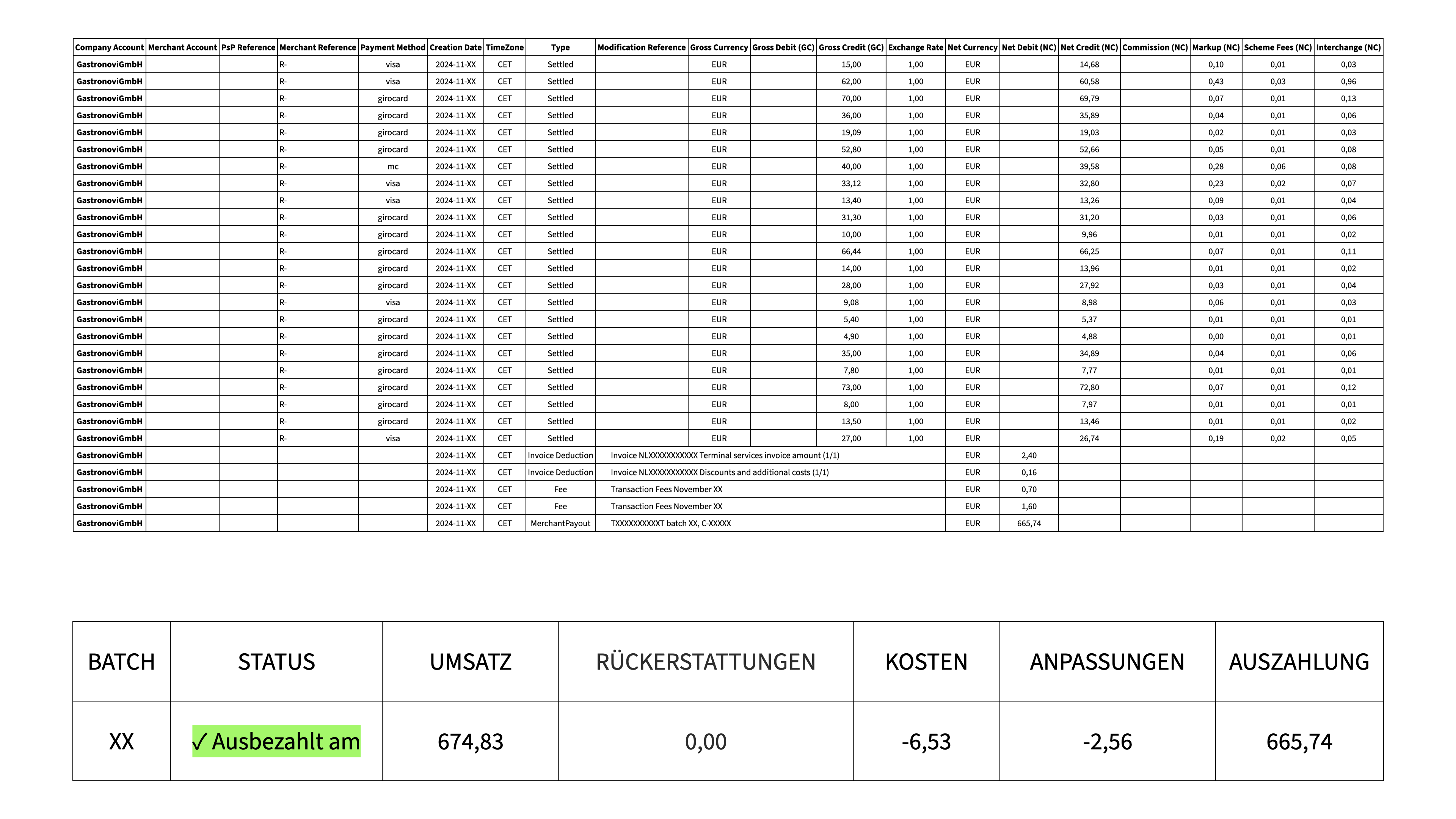 Ein Abgleich der Gebühren aus der Sales to Payout Übersicht mit der Rechnung ist nicht möglich. Aufgrund der verzögerten Auszahlung (i.d.R. + 2 Tage) und die unterschiedlichen Definitionen der Abrechnungszeiträume für die Transaktionsgebühr und der Gebühren für die Zahlungsmethoden erschwert den Vergleich (siehe Bereich Allgemein).