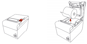 Bitte öffnen Sie die Drucker-Abdeckung und legen Sie die Bonrolle wie am Drucker abgebildet in den Drucker ein. Achten Sie darauf, dass Sie eine für den Druckertyp passende Bonrolle verwenden.